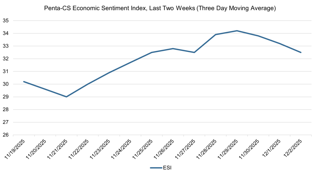 The ESI’s three-day moving average began this two-week stretch at 30.2 on November 19. It then decreased, falling to a low of 29.0 on November 21. The three-day moving average then trended upward, rising to a high of 34.2 on November 29 before dipping to 32.5 on December 2 to close out the session.