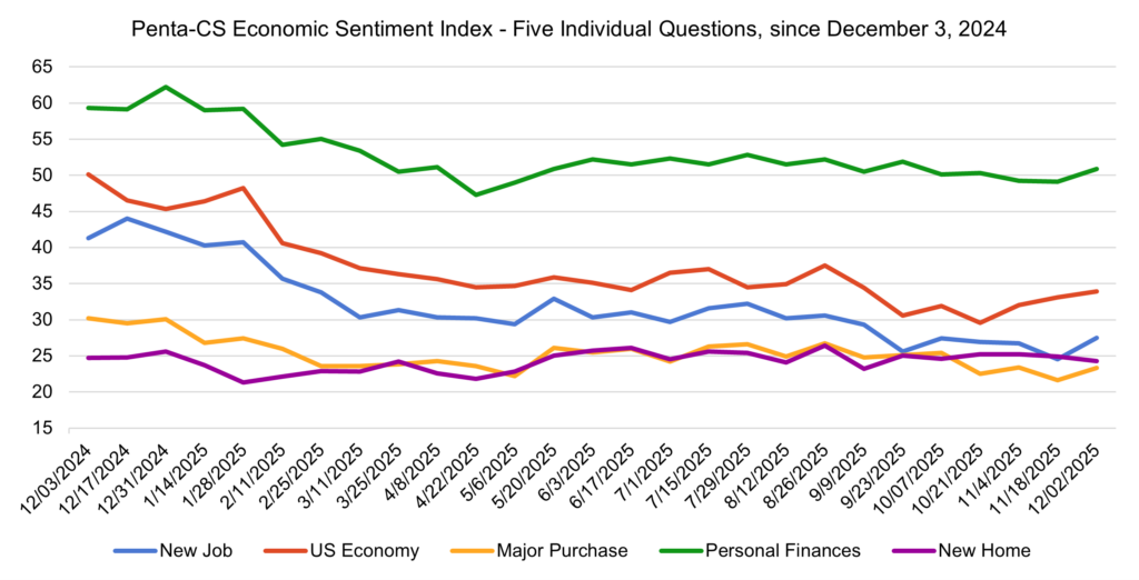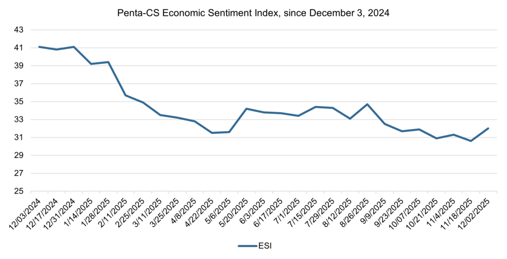 The latest biweekly reading of the Penta-CivicScience Economic Sentiment Index (ESI) rose by 1.4 points, from 30.6 to 32.0, ahead of the December meeting of the Federal Open Markets Committee (FOMC).