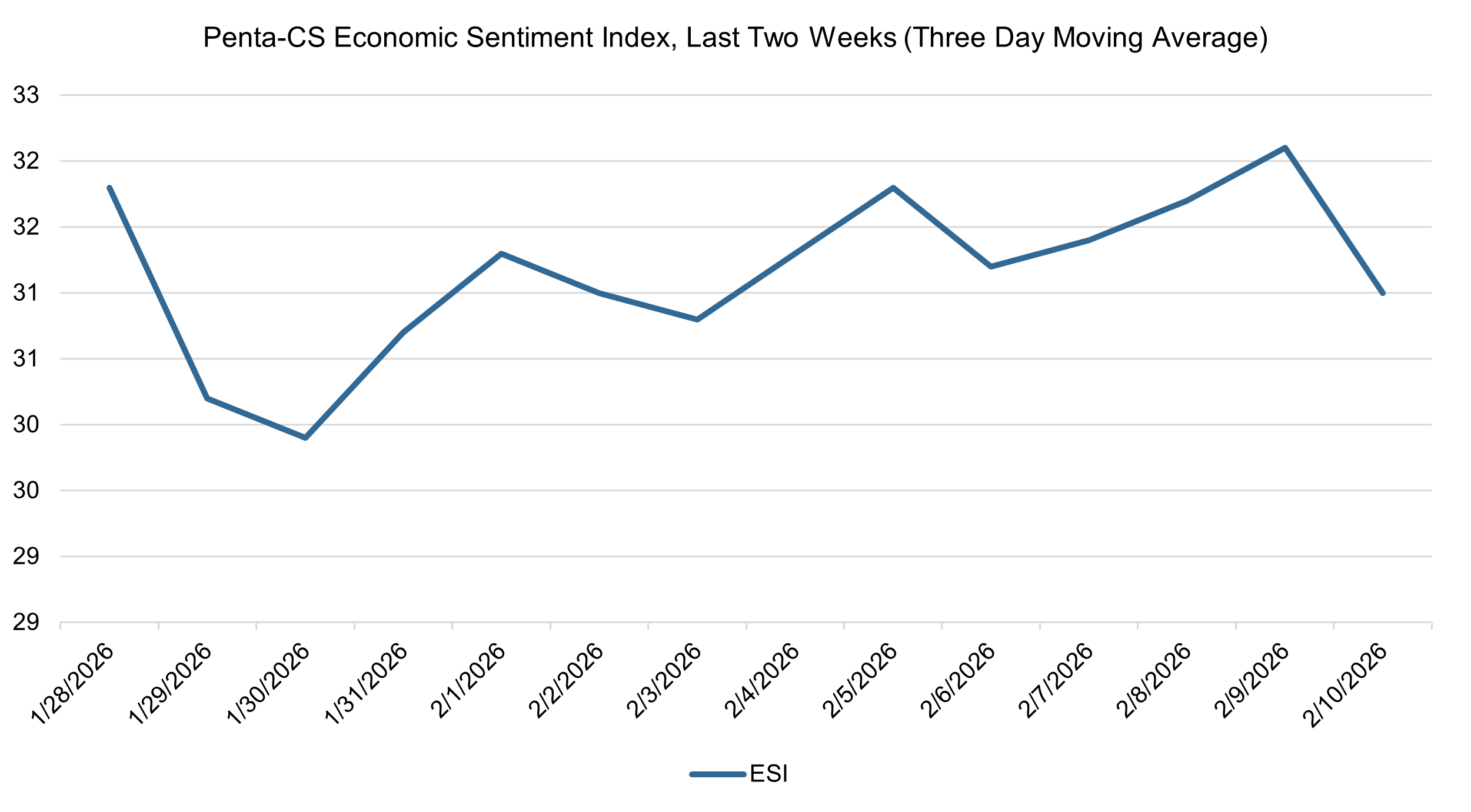 The ESI’s three-day moving average began this two-week stretch at 31.8 on January 28 before falling to a low of 29.9 on January 30. It then oscillated between rising and falling, trending upwards to a high of 32.1 on February 9. The three-day moving average then decreased, falling to 31.0 on February 10 to close out the session.