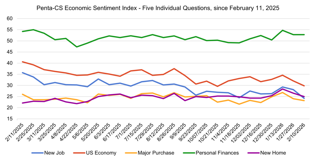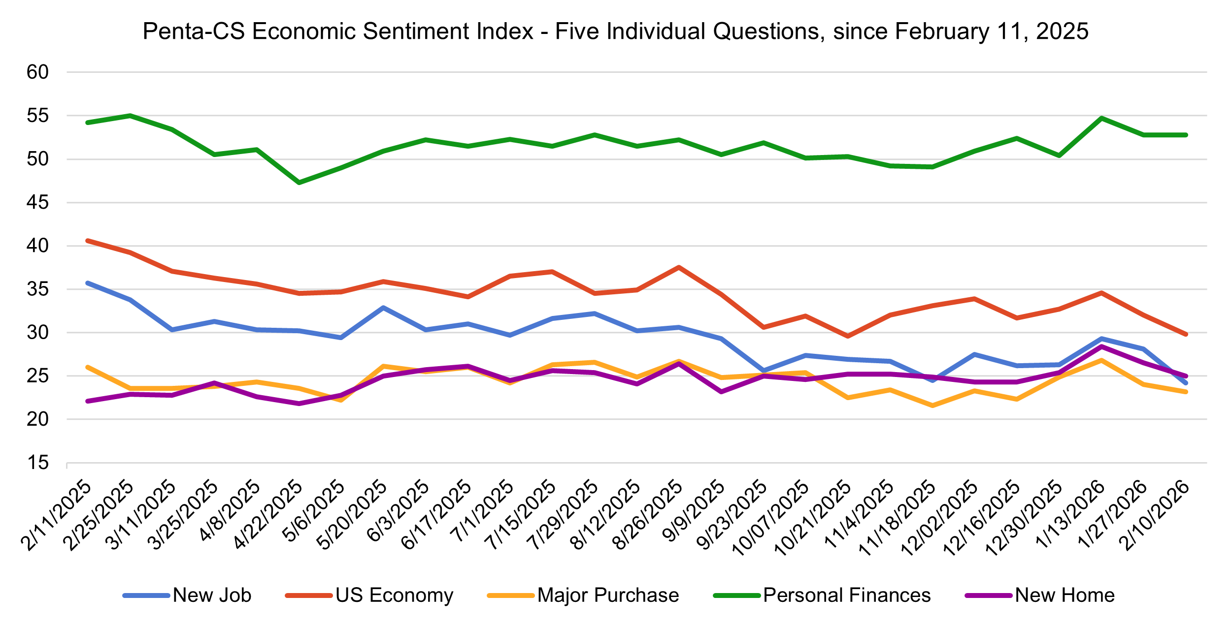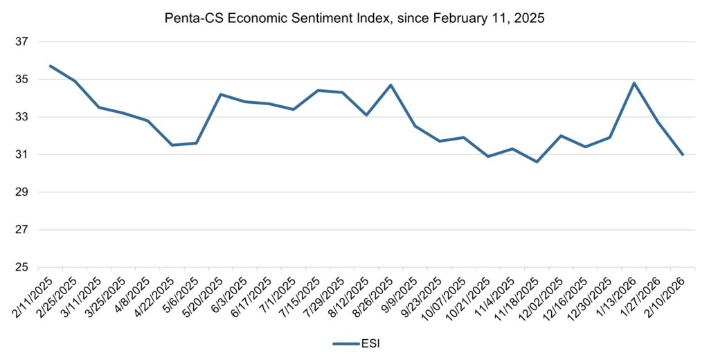 The latest biweekly reading of the Penta-CivicScience Economic Sentiment Index (ESI) fell by 1.7 points to 31.0, continuing its sharp decline and hitting its lowest level since November 2025.