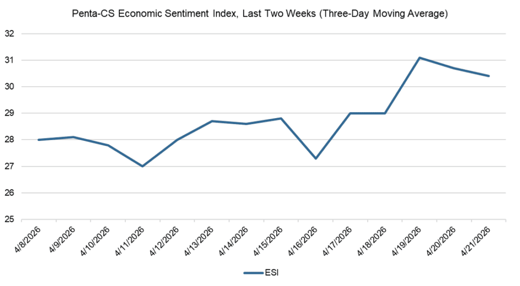 The ESI’s three-day moving average began this two-week stretch at 28.7 on March 25. It then decreased slightly before rising to a high of 30.7 on March 29. The three-day moving average then trended downward, falling to a low of 26.5 on April 5 before rising up to 27.1 on April 7 to close out the session.