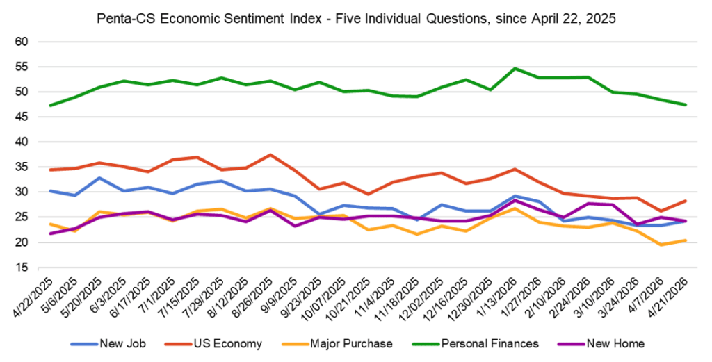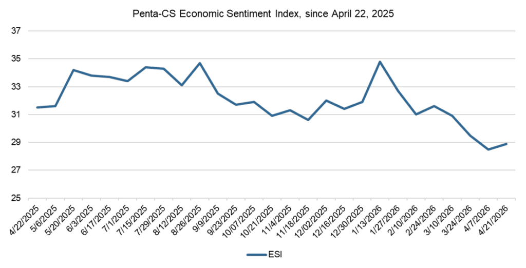 The latest biweekly reading of the Penta-CivicScience Economic Sentiment Index (ESI) fell by 1.0 point to 28.5, surpassing the prior record low from last period and marking the weakest level since the index began in 2013.