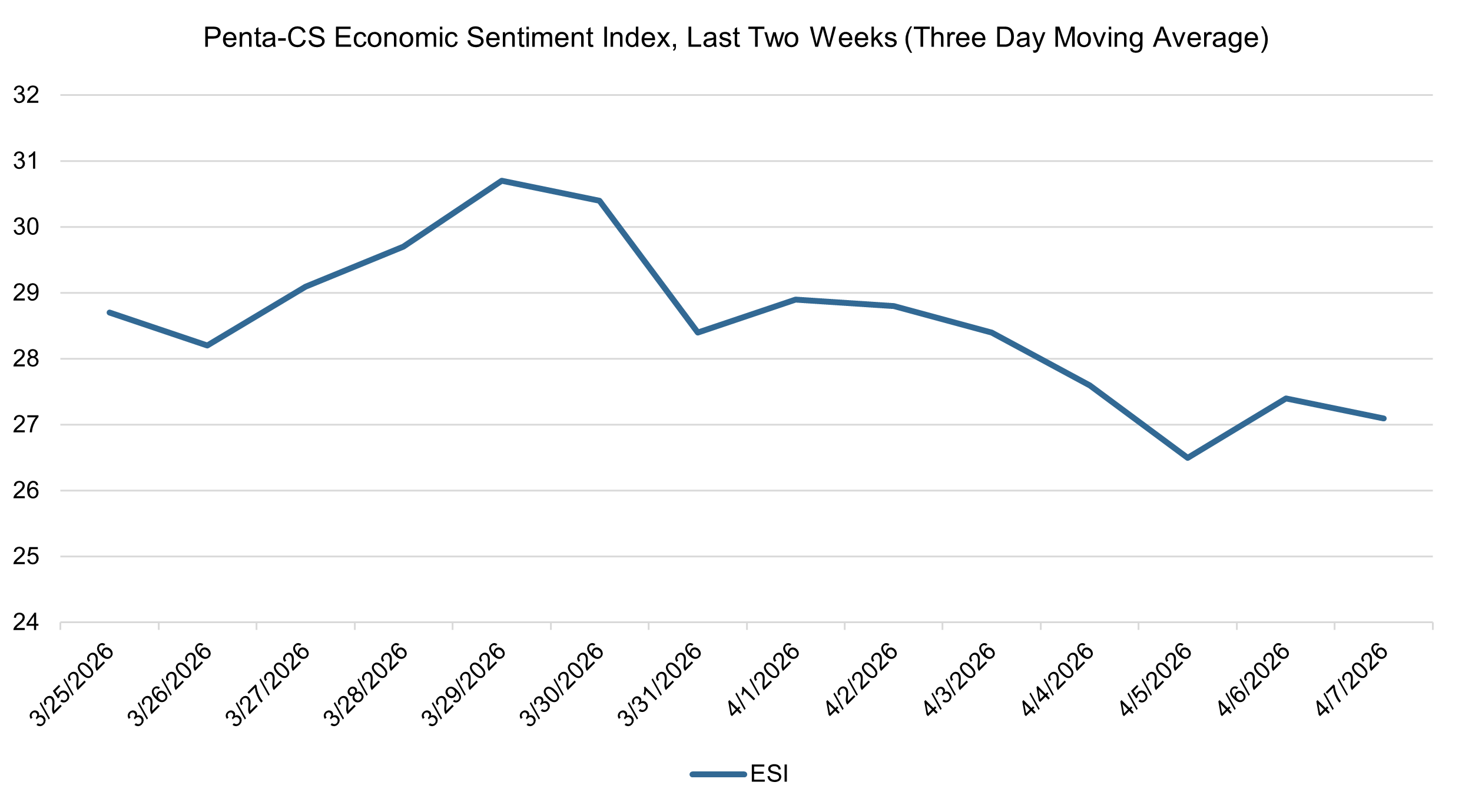 The ESI’s three-day moving average began this two-week stretch at 28.7 on March 25. It then decreased slightly before rising to a high of 30.7 on March 29. The three-day moving average then trended downward, falling to a low of 26.5 on April 5 before rising up to 27.1 on April 7 to close out the session.