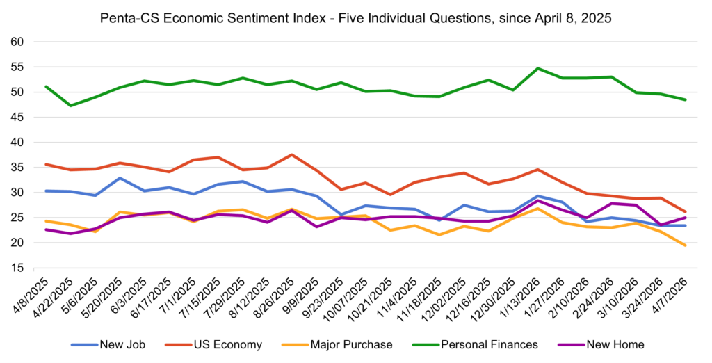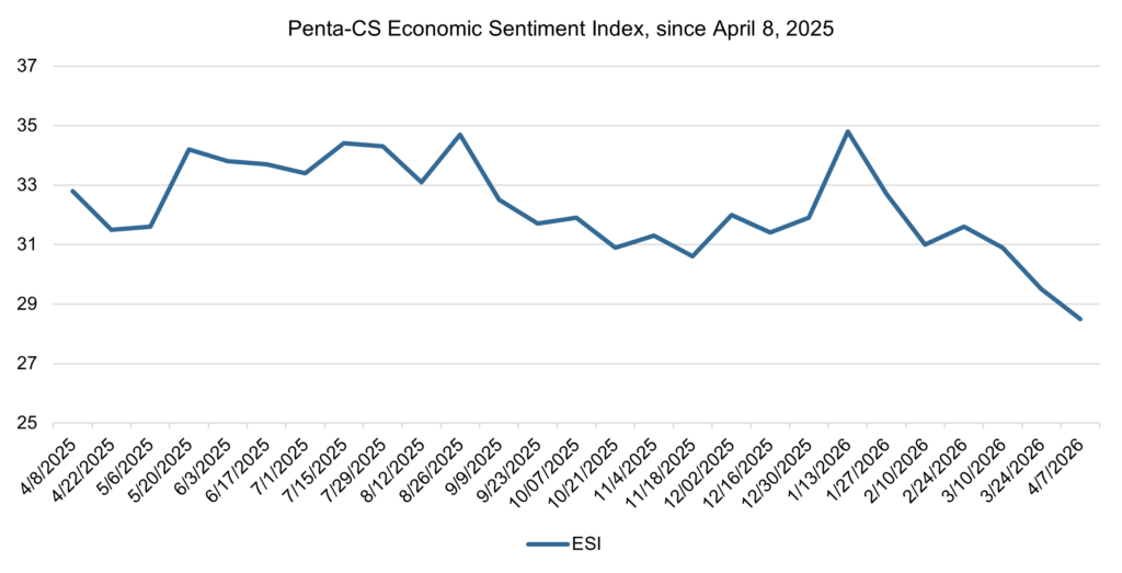 The latest biweekly reading of the Penta-CivicScience Economic Sentiment Index (ESI) fell by 1.0 point to 28.5, surpassing the prior record low from last period and marking the weakest level since the index began in 2013.