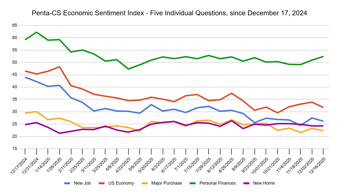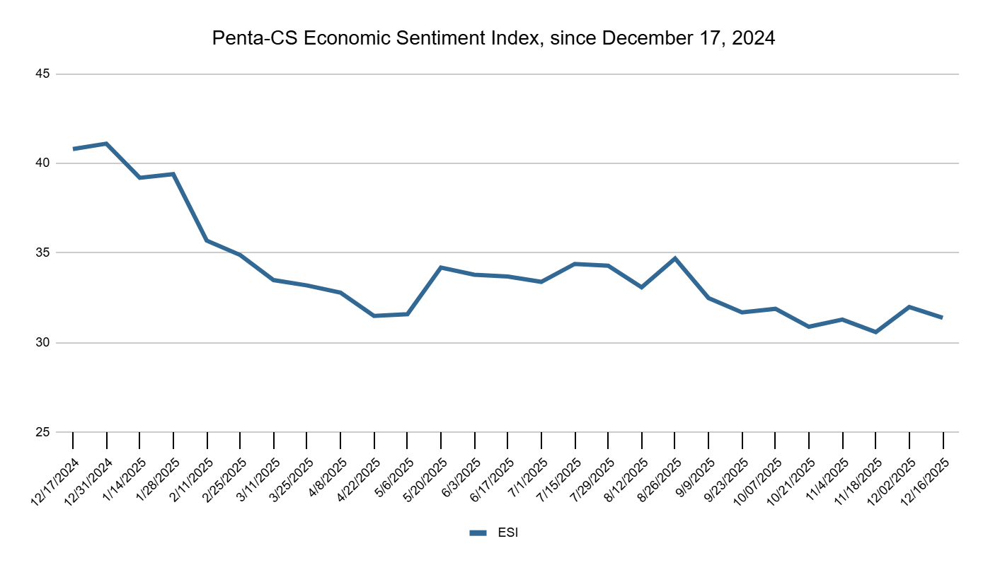 The latest biweekly reading of the Penta-CivicScience Economic Sentiment Index (ESI) decreased by 0.6 points, from 32.0 to 31.4, marking a dip in overall economic confidence ahead of the new year.